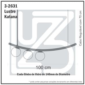 Descrição Técnica: - Modelo: Lustre Pendente Ktna - Acabamento: Pintura a pó térmica - Tamanho dos Globos de Vidro: 140mm - Quantidade de Globos de Vidro e soquetes: 3 - Material: Globo em Vidro e Hastes em Alumínio - Tamanho Aproximado (LxAxP) com os Globos de Vidro: 100 cm X 20 cm X 20 cm - Cabo: Cabo Revestido em Tecido - 70cm - Soquete: Padrão G9 - Bivolt: Sim