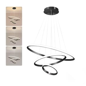 Este lustre pendente em formato de 3 anéis proporciona uma iluminação moderna e elegante, ideal para decorar salas de jantar, quartos, escritórios e outros ambientes.