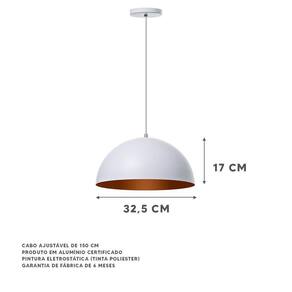 Especificações Técnicas: Marca: Ideallume Modelo: Meia Lua Produto: Lustre Cor: Branco Dimensões: 17 x 32,5 cm Canopla: redonda de 11cm de diâmetro Material: Alumínio Fio: Ajustável de 150cm Soquete: E-27 utilize a lâmpada que desejar Garantia: Garantia de 6 meses contra defeitos de fabricação
