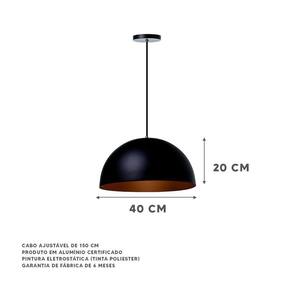 O Lustre Pendente Meia Lua Preto 40Cm possui dimensões de 20 x 40 cm e vem com uma canopla redonda de 11 cm de diâmetro. O fio é ajustável com 150 cm de comprimento, o que facilita a instalação de acordo com a altura desejada. O soquete utilizado é o E-27, permitindo que você utilize a lâmpada de sua preferência.