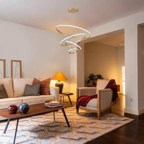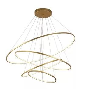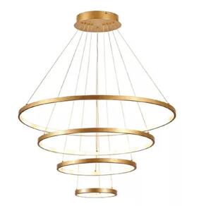 Especificações: - Modelo: Pendente Led 4 Anéis - Cor do acabamento: Dourado, Preto ou Branco (selecionar a cor antes de clicar em comprar) - Iluminação por LED - Potência: 130W - Cabo: 4 metros, ideal para pé direito alto (Fácil ajuste nos 4 aros individualmente para fazer o seu design). - Cor da luz (Temperatura): Amarela/Quente (3900K), Branco Quente/Neutra (4900K) e Branco Frio (5700K) - Material: Cabo de aço, estrutura em alumínio, iluminação led e silicone - Acabamento: Arco com fita led removível e fechamento em silicone