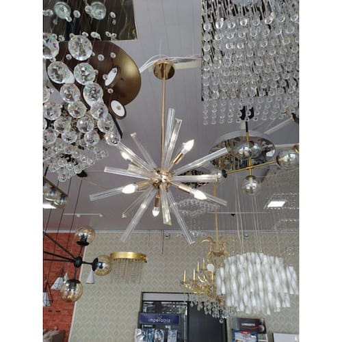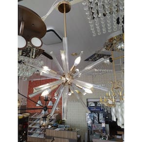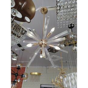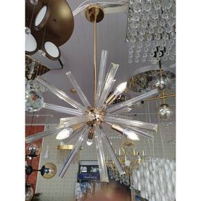 Lustre em Cristal transparente com estrutura em alumínio dourado. Diâmetro 66 cm; altura 100 cm. Capacidade para 06 lampadas E14