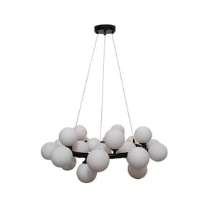 Descrição Material: estrutura em metal e cúpula redonda de vidro Cor: estrutura preto fosco e cúpulas branca leitosa Quantidade de lâmpadas: 25 lâmpadas não inclusas Bocal: g9 em led Medidas: 26 x 70 cm altura x diâmetro
