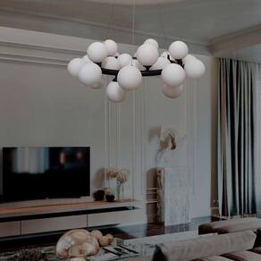 Descrição Material: estrutura em metal e cúpula redonda de vidro Cor: estrutura preto fosco e cúpulas branca leitosa Quantidade de lâmpadas: 25 lâmpadas não inclusas Bocal: g9 em led Medidas: 26 x 70 cm altura x diâmetro Ean: 7898612683451