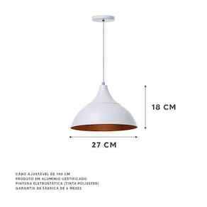 Deixe sua casa muito mais moderna e sofisticada com o Lustre Pendente Panamá Da Ideallume. Produzido em alumínio, o produto não enferruja. O Lustre é ideal para ser utilizado em áreas externas e internas. Com esse produto você dará um toque de beleza que valoriza sua casa. Especificações Técnicas: Marca: Ideallume Modelo: Panamá Produto: Lustre Cor: Branco Com Cobre Dimensões: 18x27cm Canopla: redonda de 11cm de diâmetro Material: Alumínio Fio: Ajustável de 150cm Soquete: E-27 utilize a lâmpada que desejar Garantia: Garantia de 6 meses contra defeitos de fabricação IMPORTANTE: Lâmpadas não inclusas neste produto. Conteúdo Da Embalagem: 1x Lustre Pendente Panamá Branco Com Cobre Ean: 2960005001229