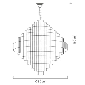 Com dimensões de 1,62m de altura total e 80cm de diâmetro, este modelo combina estrutura em aço e cúpula formada por cristais que refletem a luz de forma elegante. Seu design imponente torna o ambiente mais acolhedor e refinado.