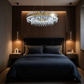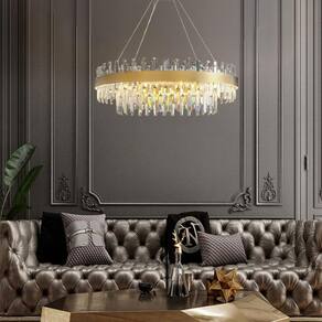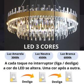 Lustre Pendente Teto 137cm x 58cm LED 3 Cores 87 Cristais Redondo Gimpo KJDD-L-405-60CM Lustre Redondo 137cm x 58cm LED 87 Cristais 3 Cores Gimpo KJDD-L-405-60CM. Estrutura Aço Inox. Cristais customizáveis. Regulagem de Altura. LED Multitemperatura 3 Cores 3x1 . Potência 80 Watts. Bivolt. Branco quente 3000k, branco neutro 4500k e branco frio 6000k. Transforme seu ambiente com elegância e sofisticação com o Lustre Pendente Luminária de Teto Gimpo KJDD-L-405-60CM. A escolha perfeita para iluminar e modernizar com muito requinte. Combina materiais de alta qualidade e garante uma iluminação deslumbrante e encantadora. Uma obra prima luminosa formada por 87 cristais, pela solidez do aço inoxidável e pela pintura eletrostática metálica resistente à corrosão, calor e ao tempo. O cristal utilizado neste pendente é uma fonte de brilho e transparência que fascina. E o mais incrível: é possível ajustar e variar a altura dos cristais na estrutura da luminária, para criar diferentes arranjos e configurações Podem ser dispostos todos linearmente, ou deixar os cristais internos mais baixos que os de fora, ou zigue-zague, formação serra, padrão onda, e muito mais A criação é livre. Sem contar que os cristais são um luxo à parte. Criam reflexos e padrões que preenchem com uma aura de beleza e magia. Simplesmente refinado e impactante. A estrutura metálica redonda possui 58cm de diâmetro, e é sustentada por 3 cabos de aço prateados com 115m de extensão, além de contar com cabo elétrico de mesma medida, transparente. O lustre totalmente montado alcança 137cm de altura em relação ao teto, a qual pode ser facilmente ajustada, conforme necessidade da instalação. Já vem com LED multitemperatura de 80 Watts instalado, pronto para uso, com 3 intensidades de cores: branco quente 3000K , branco neutro 4500K e branco frio 6000K . A seleção das luzes é feita através do . Ao acender e apagar a luz liga / desliga é possível alternar entre os três tons de luz. Isto faz com que a cor do LED seja alterada, uma cor após a outra. Deste modo, controla-se a luminosidade e também a potência de Watts que é enviada para o LED, além da atmosfera certa, a qualquer momento, para refletir as mais diferentes emoções. É compatível com tensão Bivolt, o que permite ligar em 110v e em 220v. Luminárias Gimpo. Elementos de beleza que transformam decorações. Especificações: 1 Luminária 58cm diâmetro 87 Cristais Gimpo KJDD-L-405-60CM. Material: aço e cristal. Medidas montada: 137cm altura x 58cm diâmetro. Medida da estrutura: 58cm diâmetro x 4 cm altura. Base canpola : 15cm diâmetro x 4cm altura, sobrepor. Diâmetro estrutura externa: 58cm. Diâmetro estrutura interna: 30cm. Largura da parte externa à interna: 14cm. Altura lateral da estrutura: 4cm. Porção de fora: 54 cristais. Porção de dentro: 33 cristais. Quantidade total: 87 cristais. Medida do cristal: 20cm altura x 2cm largura x 0,8cm espessura. Cabo de aço de sustentação: 115cm, 3 peças, reguláveis, prateados. Fiação elétrica: 115cm, regulável, transparente. LED driver 3 cores multitemperatura: 80 Watts. Fiação já instalada no driver. Voltagem: 110v / 220v Bivolt . Ligação: corrente elétrica. Acompanha kit parafusos, buchas, arruelas e travessa. Necessita montagem: no teto. Peso total: 7,3kg. Medidas da caixa: 67 x 67 x 17cm. : 3 Meses. Modelo: KJDD-L-405-60CM. EAN: 7898680305439. Marca: Gimpo.
