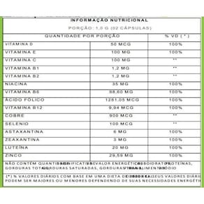 Vitamina d3 , vitamina e , vitamina c , vitamina b1, vitamina b2, niacina , vitamina b6, vitamina b9 , vitamina b12 , sulfato de cobre, selenito de sódio, ésteres de astaxantina de haematococcus, zeaxantina, luteína da flor de tagetes erecta, bisglicinato de zinco.