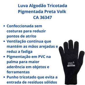 Luva Algodão Tricotada Pigmentada Preta Volk CA 36347 Conforto e aderência para tarefas leves do dia a dia Luva tricotada em mistura de algodão e fibras sintéticas, com pigmentos de PVC na face palmar, garantindo ventilação e pegada segura sem abrir mão do conforto.