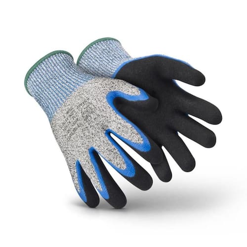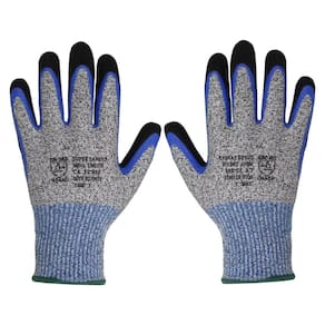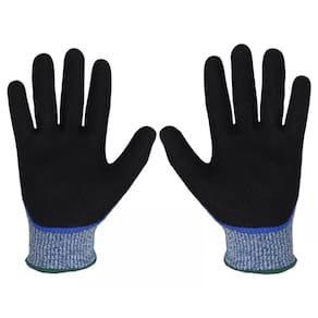 Luva de segurança confeccionada com fios de elastano e fibra de vidro com polietileno ( HPPE - Polietileno de alta densidade), revestida com poliuretano, na face palmar e pontas dos dedos, punho com elastano e formato anatômico.