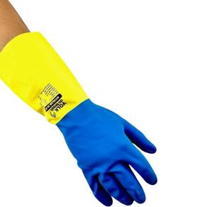 A luva em látex natural com reforço em neoprene oferece proteção química e mecânica, forro flocado em algodão e grip colmeia antiderrapante, garantindo segurança em atividades médias e severas.
