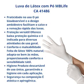 Marca: MBLife. CA: 41486. Material: Látex de borracha 100% natural. Cor: Branca. Características: Com pó bioabsorvível (amido de milho Grau U.S.P), ambidestra, lisa, não estéril, atóxica, apirogênica, descartável, de uso único. Embalagem: Caixa com 100 unidades.