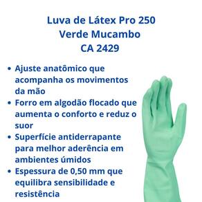 A luva de Látex Pro 250 Verde Mucambo, com CA 2429, é um equipamento anatômico, feito em látex natural com forro em algodão flocado. A superfície antiderrapante na palma e nos dedos garante o manuseio seguro de objetos e substâncias leves.