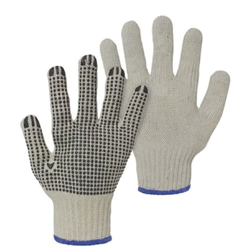 - Luva de segurança confeccionada em malha de algodão, pigmentos em PVC na palma, dedos e pontas dos dedos, punho com acabamento em elastano e costura com overloque.