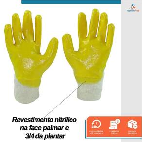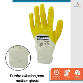 A Luva em Malha Tricotada Revestida de Nitrílico Parcial Amarela Tamanho M da Starfer é uma peça de segurança confeccionada em malha de algodão tricotada em uma única peça, destacando-se pelo revestimento nitrílico na face palmar e 3/4 da plantar, acompanhada por um punho elástico para ajuste otimizado. Possui o Certificado de Aprovação CA Nº 49.472, disponível no tamanho 8/M, e apresenta uma combinação de cores, sendo a palma, ponta dos dedos e parte do dorso em amarelo, enquanto a porção restante do dorso e o punho são em tom bege.