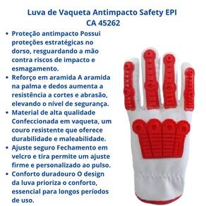 Especificações técnicas - Marca: Safety EPI. - CA 45262. - Material: Vaqueta na palma e dorso, reforço de aramida na face palmar e dedos. - Proteção: Antimpacto no dorso. - Fechamento: ajustável com tira.