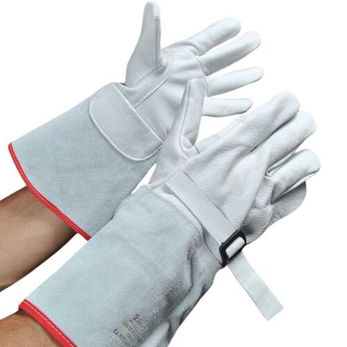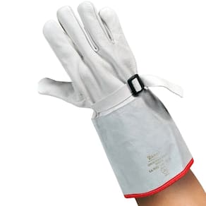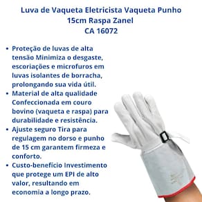 Marca: Zanel. CA 16072. Tipo: Luva de cobertura para eletricista. Material: Couro bovino curtido ao cromo e vaqueta (palma, dorso, dedos), punho em raspa. Tamanho: Unico Comprimento do punho: 15 cm. Espessura média da raspa: 1,50 mm. Espessura média da vaqueta: 1,10 mm. Acabamento: Viés vermelho, tira para regulagem no dorso. Costura: Algodão ou Aramida. Função: Proteger a luva isolante de borracha (não protege o trabalhador contra riscos elétricos).