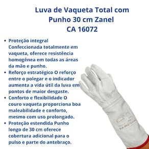 Especificações técnicas - Marca: Zanel. - CA 16072. - Tipo: Luva de segurança total. - Material: Couro bovino curtido ao cromo tipo Vaqueta (palma, dorso e punho). - Comprimento do punho: 30 cm. - Características: Reforço entre o polegar e o indicador, dorso liso.