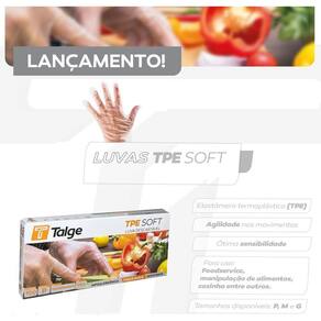Luva descartável tpe soft talge c/100un A luva tpe soft combina a praticidade da luva de plástico com um maior conforto e resistência. São de uso único e após o seu uso devem ser descartadas adequadamente. O produto não é passível de certificado de aprovação ca , pois não é classificado pela norma nr6 como epi. Não possui registro anvisa, sendo assim, não pode ser utilizado em procedimentos cirúrgicos e demais procedimentos hospitalares e odontológicos. É indicada para atividades leves gerais como tarefas domésticas, uso veterinário, indústrias alimentícias, restaurantes, salões de beleza, jardinagem, entre outros.