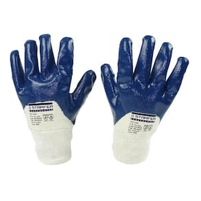 A Luva em Malha Tricotada Revestida de Nitrílico Parcial Azul Tamanho M da Starfer é uma peça de segurança confeccionada em malha de algodão tricotada em uma única peça, destacando-se pelo revestimento nitrílico na face palmar e 3/4 da plantar, acompanhada por um punho elástico para ajuste otimizado. Possui o Certificado de Aprovação CA Nº 49.476, disponível no tamanho 8/M, e apresenta uma combinação de cores, sendo a palma, ponta dos dedos e parte do dorso em azul, enquanto a porção restante do dorso e o punho são em tom bege.