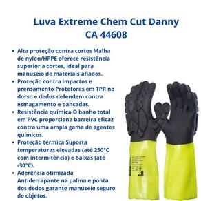 Especificações técnicas Marca: Danny. CA 44608. Modelo: Extreme Chem Cut DA43150. Material: Malha de nylon/HPPE sem costuras, banho total em PVC, protetores em TPR. Características: Antiderrapante na palma, face palmar dos dedos e ponta dos dedos. Resistência Térmica: Até 250°C (calor de contato intermitente) e até -30°C (baixa temperatura).