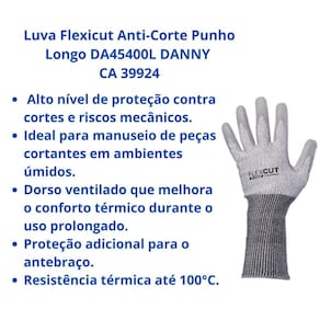 Luva Flexicut Anti-Corte Punho Longo DA45400L DANNY CA 39924 A Luva Flexicut Anti-Corte Punho Longo DANNY CA 39924 é desenvolvida para oferecer alta proteção contra cortes em ambientes com presença de umidade. Confeccionada em polietileno de alta densidade e recoberta com poliuretano na palma e nos dedos, ela garante resistência contra lâminas e metais, enquanto seu formato anatômico com dorso ventilado proporciona conforto térmico durante longos períodos de uso, além de oferecer proteção para o antebraço e suportar temperaturas de até 100°C.