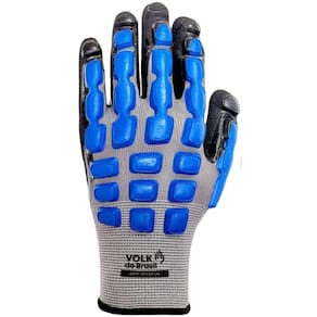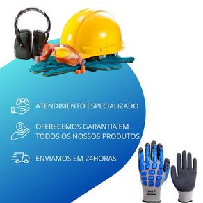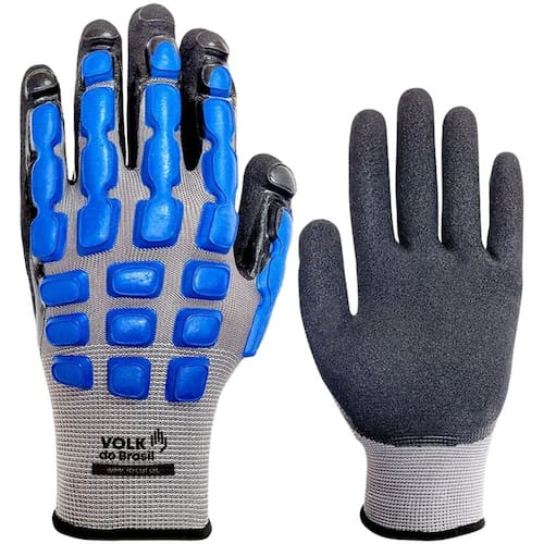 Marca: Volk CA: 48587 Material: HPPE (polietileno de alta densidade), nylon e spandex (suporte têxtil tricotado). Revestimento: Banho nitrílico com acabamento tipo Sandy (palma e ponta dos dedos). Proteção de Impacto: Gomos em borracha natural termoplástica (TPR) no dorso. Punho: Tricotado com inserções de fibras elásticas. Grip: Arenoso. Bitola: 15 gauge. Uso: Reutilizável. Formato: Anatômico.