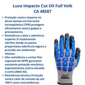 Luva Impacto Cut Oil Full Volk CA 48587 Proteção Total contra Cortes, Impactos e Óleo A Luva Impacto Cut Oil Full da Volk é uma luva de segurança de alta performance, projetada para oferecer proteção abrangente contra agentes mecânicos (abrasão, corte, rasgo, perfuração, corte por TDM e impacto), especialmente em ambientes com presença de óleo. Confeccionada em HPPE (polietileno de alta densidade), nylon e spandex (15 gauge), ela possui um inovador banho nitrílico com acabamento tipo Sandy na palma e ponta dos dedos, garantindo resistência a óleo e aderência segura mesmo em peças oleosas. O dorso é reforçado com protetores de impacto em borracha natural termoplástica (TPR), protegendo contra prensamento e golpes. Além disso, oferece resistência térmica de até 100°C (com intermitência de 15 segundos) e alta resistência ao corte (ANSI A5). Benefícios
