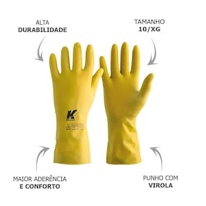 Informações Adicionais: Marca: Kalipso Tamanho: 10/XG Cor: Amarelo EAN: 7898390942856 Código Fabricante: 02.04.5.4 Normas Técnicas: ABNT NBR ISO 374-1:2019, BS EN 388:2016 + A1:2018, BS EN 420:2003 + A1:2009 Validade: 5 Anos