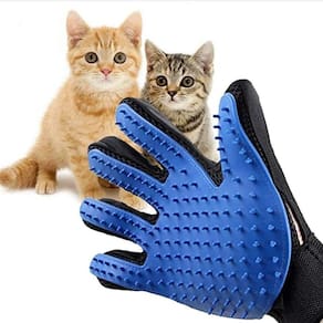 Escova no formato de luva para facilitar a remoção de pelos nas partes mais difíceis como calda ou rosto.