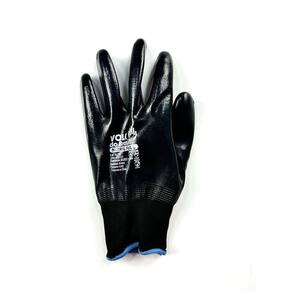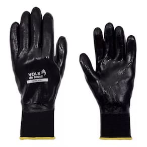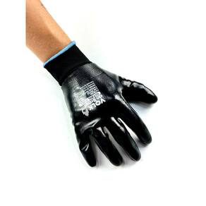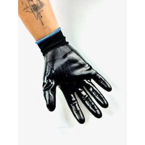 Luva de segurança confeccionada em fibras sintéticas, totalmente revestida com nitrila, lisa, punho em fibras elásticas e acabamento em fibras sintéticas.