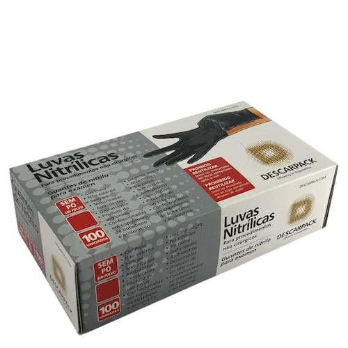 - Descarpack contém: 01 cx 100 unidades luvas nitrílicas Tamanho P sem pó - Preta - não estéril - livre de látex - sem pó bioabsorvível - texturizada - ambidestra - aprovada pelo ministério do trabalho c.A - disponível nas cores azul, preta e rosa - descartável e de uso único proibido reutilizar - deve ser descartada em local apropriado após o uso.