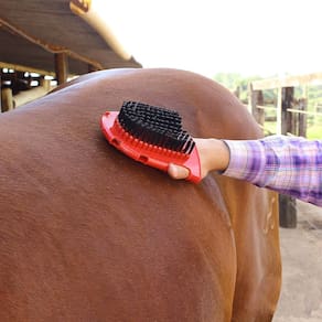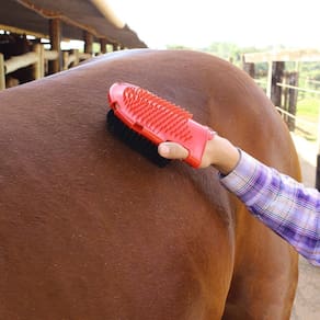 A Luva de Borracha Dupla Face da marca Boots Horse é o acessório ideal para cuidar da higiene e do bem-estar dos cavalos. Feita com materiais de alta qualidade, esta luva é durável, resistente e eficiente para a remoção de sujeira, pelos mortos e poeira. Com duas faces diferentes, esta luva possui uma superfície de borracha com cerdas suaves para escovar e massagear a pele do animal, removendo sujeiras superficiais e estimulando a circulação sanguínea. Já a outra face é composta por uma superfície de borracha mais dura e com relevos, ideal para a raspagem das partes mais grossas da pele e dos pelos. Com essa função, é possível remover sujeiras mais difíceis, como lama seca, pelos soltos e outros detritos que possam acumular na pelagem do animal. A luva é fácil de usar e se ajusta perfeitamente à mão do usuário, garantindo conforto e segurança durante o manuseio. Além disso, sua durabilidade e resistência fazem com que ela seja uma ferramenta indispensável para os cuidados com os cavalos, sendo muito utilizada em haras, clubes hípicos e criadores de equinos em geral.