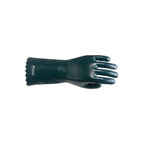 Confeccionada em PVC com palma áspera, a luva para proteção das mãos tem punho long e está disponível na cor verde.