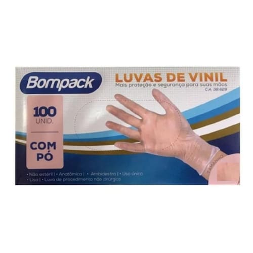 Luvas Bompack Vinil 100 Unidades Tamanho M Com Pó de segurança confeccionada em resina vinílica; não esterilizada, com pulverização interna de pó bio absorvível amido de milho ambidestra, superfície, uso único ,externa lisa. Descrição do Produto C.A. 39.386 caixa com 100 Unidades .Luva de vinil .Descartavel .Transparente com pó . Não contem latex . Hipoalergenico INSTRUÇÕES DE USO .Lavar e secar bem as mãos antes do uso .Verificar o tamanho correto para suas mãos .Calçar as luvas cuidadosamente, recomenda-se retirar anéis ou outros acessórios que passam perfurar a luva .Armazenar o produto em local limpo, seco, arejado e protegido da luz solar .Possibilidade de redução ou perda da sensibilidade tátil .Não são conhecidos malefícios prejudiciais à saúde do usuário. Atenção PROIBIDO REPROCESSAR deve ser descartada em local apropriado após o uso . Fabricado por LPL HUI ZHOU GLOVE CO.LTD. Responsável Técnico: Rafael Vieira CRF/SC - Nº 3742 Imagens Meramente Ilustrativas Ean: 7898921466905