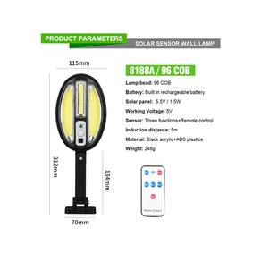 Características:\ nA tecnologia de detecção de corpo humano o torna mais eficiente em termos de energia\ nAcende quando detecta movimento\ nLuz fraca quando não há movimento. Impermeável, alto brilho e economia de energia\ nTemperatura de cor: 6000K\ NTensão: 5 V\ nVida útil: 10000 h\ nPainel solar: 1,5 W/6 V\ NTipo de bateria: bateria de lítio 18650 de 1800mAh\ nTempo de carregamento: 6-8 horas\ n8-10 horas\ nModelo de trabalho: 3 modelos SAME-70W: 31,2 x 11,7 cm
