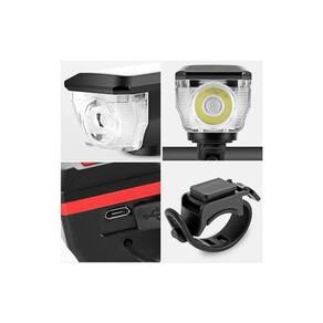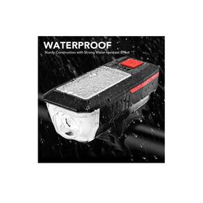 Luz LED frontal de bicicleta com buzina solar recarregável Pode funcionar como holofote frontal de 120 dB e campainha de buzina. Instalação sem ferramentas, operação simples e rápida. Boa resistência à água, pode ser utilizado em dias chuvosos. Design côncavo especial, não danifica a dose enquanto impede a entrada da chuva. O carregamento USB/Solar com um indicador de bateria preciso oferece vida útil extra longa e forte entrada de energia. Modelo: FX-Q18. Material: ABS + Silicone. Lúmens: 350Lm. Decibel do alto-falante: 120dB. Capacidade da bateria: 2000mAh. Bateria interna recarregável. Distância: 10m. Modos de luz: alto, baixo e intermitente. Modos de carregamento: carregamento solar e USB. Quantidade de sons de buzina: 6. Resistente a respingos de água (chuva)\ n1 x luzes LED para bicicleta