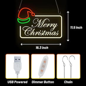 Sinal neon de Feliz Natal: Luzes neon de LED reguláveis para decoração de parede - Decorações de iluminação ambiente ideal para quarto de crianças em casa - Placa de parede neon de Natal: combine a luz neon de Natal com outras decorações de parede para criar um ambiente de férias único e hipnotizante - Decoração e presente ideais de férias: O letreiro de luz neon adiciona um toque festivo a qualquer cômodo, tornando-o o presente ideal para férias apaixonadas pelo Natal. - Sinal neon regulável: Com seu design de iluminação regulável de 10 níveis, você pode ajustar facilmente o brilho de acordo com sua preferência, permitindo que você crie a atmosfera perfeita para as sessões de Natal - Fácil de instalar: Quadro transparente de alta qualidade pré-perfurado com 2 ganchos e 1 corrente para você pendurar a luz neon na parede - Alimentado por USB: alimentado por cabo USB, basta conectar à porta do seu computador ou porta USB para ligar as luzes neon em ambientes internos ou externos