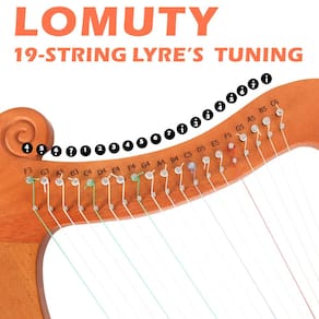 - ?Design de 19 cordas?-1(g3), 2(a3), 3(b3), 4(c4), 5(d4), 6(e4), 7(f4), 8(g4), 9(a4), 10(b4), 11(c5), 12(d5),13(e5),14(f5),15(g5),16(a5),17(f3), 18 (b5), 19(c6), escala C maior. Com mais harmonias de cordas do que uma harpa de 10 ou 16 cordas, você não precisa afinar as cordas repetidamente quando quiser tocar mais músicas em teclas diferentes.