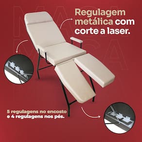 Possui regulagens de aço galvanizado com corte a laser, sendo 5 níveis de regulagens no encosto e 4 níveis de regulagens nos pés.