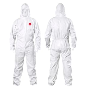 Macacão fornece uma barreira de proteção leve e efetiva contra partículas secas, além de proteção limitada contra líquidos químicos.