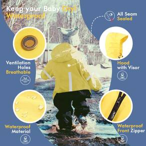 O que é este traje de chuva? Um traje de chuva para crianças e crianças pequenas com material e designs para garantir que as crianças se divirtam com segurança e que os pais cuidem da bagunça facilmente. Mas como este traje de chuva infantil alcança seu objetivo? Para vestir o traje de chuva fácil de colocar com os zíperes frontais duplos. Para brincar ao ar livre à prova d'água para menos bagunça Material: Nylon com revestimento de poliuretano anexado com viseira para manter a chuva longe do rosto do seu bebê. Zíperes frontais à prova d'água. Todas as costuras são seladas para garantir a impermeabilidade. A faixa de neoprene nos tornozelos pode ser combinada com botas de borracha à prova d'água para selar a água. Resistente reforçada com nylon extra pesado preto para assento e joelhos. Não precisa se preocupar com rasgos do material quando as crianças brincam em pedras ou galhos. Ajuste personalizado Este traje de chuva infantil tem fecho ajustável de fecho aderente nos tornozelos e pulsos pode ser alongado ou encurtado, conforme necessário, para cada criança. As tiras dos tornozelos podem ser colocadas nas botas para fixar a perna. Quente e seco por dentro. Adicione dois orifícios de ventilação para evitar que a água a vapor dentro do traje molhe as roupas e mantenha seu bebê aquecido e seco. Segurança Cor brilhante fácil de encontrar, localize rapidamente seu bebê com um olhar. O crachá de criança em idade pré-escolar dentro do traje de chuva seria útil durante uma emergência. Fitas refletivas nos braços, frente e verso adicionam segurança em ambientes externos escuros. Etiqueta de identificação para crianças em idade pré-escolar em caso de emergência. Para limpar com o material de nylon, a sujeira e a lama são facilmente enxaguadas deste traje de chuva para crianças. Para armazenamento, vem com uma bolsa de armazenamento de nylon para facilitar o armazenamento. - [Ajuste personalizado]: este traje de chuva infantil tem fecho de fecho aderente ajustável nos tornozelos e pulsos pode ser alongado ou encurtado, conforme necessário, para cada criança. A faixa de neoprene nos tornozelos pode ser combinada com botas de borracha à prova d'água para vedar a água. Observação: É projetado para ser solto para acomodar roupas por baixo, liberdade de movimento e espaço para crescimento. Meça antes de fazer o pedido de acordo com a tabela de tamanhos. - [Seguro]: Fitas refletivas nos braços, frente e verso adicionam segurança em ambientes externos escuros. Sem PVC e sem BPA. Etiqueta de identificação para crianças em idade pré-escolar em caso de emergência. Este traje de chuva para meninos mantém seu bebê seguro. - [À prova d'água]: material de classificação impermeável de 10.000 mm. Todas as costuras seladas. Zíperes impermeáveis. Tiras fixas nos pés para fixar as pernas. Capuz elástico anexado com viseira. Chega de perder tempo procurando por jaqueta de chuva infantil ou capa de chuva infantil. - [Respirável]: este equipamento de chuva para crianças tem material de nylon respirável e dois orifícios de ventilação para evitar que a água a vapor molhe seu bebê. - [Resistente, fácil de limpar e armazenar]: Reforçado com nylon extra pesado preto para assento e joelhos. Sujeira e lama enxaguam facilmente. Vem com uma bolsa de armazenamento de nylon.