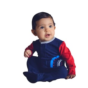 Macacão Magnético Marinho, detalhes vermelho e cinza com estampa arco-íris - 12 meses - Welpie