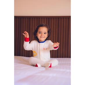 Macacão Magnético Off, detalhes vermelho e azul royal com letras e números nas mangas - Recém nascid - Welpie