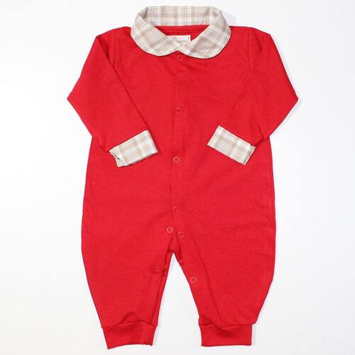 Macacão de bebê menino cor vermelho com detalhe xadrez bege, confeccionado em malha 100% algodão. O macacão para bebê é uma roupinha muito útil, pois quando o bebê esta vestindo um macacão ele estará pronto para qualquer atividade, além de deixar seu príncipe super confortável. Disponível nos tamanhos RN, P, M e G.