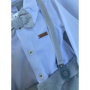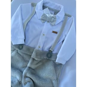 Características do Produto: - Macacão em pelo super macio, quente e confortável. Finta suspensório com a parte superior frontal e mangas em plush. Na frente supensório de elástico com metal e courino, que dá um charme todo especial a peça. Detalhe de plaquinha da marca e gravatinha borboleta com elástico que pode ser removida. Na parte superior da frente abertura por botões. Na parte inferior e entre pernas com botões de pressão. Simplesmente um luxo!