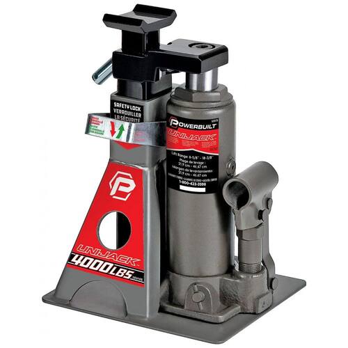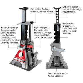 INTELIGENTE: Levante e segure com segurança seu carro, CUV ou SUV pequeno sem a necessidade de macacos separados. O design patenteado levanta e segura combinando um macaco para garrafa com um suporte em uma unidade.