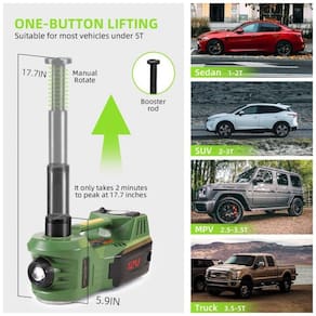 O Sistema de Elevação Potente com motor de cobre puro de alta potência, suporta elevação de até 5,0 toneladas, com alcance de elevação de 15.5 a 45 centímetros. Substitui as cansativas ferramentas tradicionais de troca de pneus manuais com operação simples que economiza tempo e esforço, o sistema de controle instantâneo completa a elevação do veículo em apenas 2 minutos, aumentando significativamente a eficiência em comparação com os macacos manuais tradicionais. Adaptação a Ambientes Severos: o motor pode operar normalmente dentro da faixa de temperatura de -15°C a 50°C, garantindo operação confiável em condições extremas, incluindo áreas de alta altitude, costeiras e extremamente frias. Uso Multicenário: Com luz LED embutida brilhante e design à prova d'água em todo o corpo, facilita a troca de pneus em noites escuras e chuvosas. O macaco é versátil, podendo ser utilizado em diferentes cenários, seja na garagem de casa, viagens, oficinas mecânicas, fazendas ou em emergências na estrada.