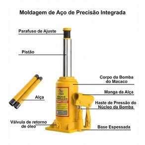 Fabricado em estrutura metálica resistente, possui sistema hidráulico de acionamento manual que proporciona elevação gradual e estável. Conta com parafuso de extensão para ajuste de altura, permitindo melhor adaptação ao ponto de apoio.