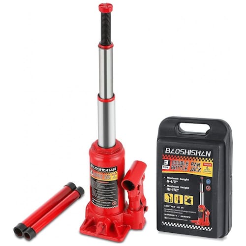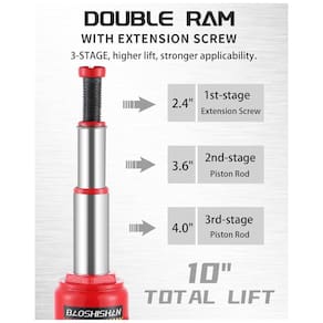 RAM DUPLO O design de ram duplo, junto com a parte superior do parafuso de extensão, significa que você tem 3 estágios de curso de elevação, proporcionando uma gama de movimentos superior em comparação com um conector de garrafa de 3 toneladas de ram único tradicional. Você tem quase o dobro da altura de elevação, já que o segundo tubo não começa a se estender até que o primeiro atinja sua altura máxima. Altura de elevação inicial: aproximadamente 0,165 metros 16,5 centímetros Altura de elevação máxima: cerca de 0,42 metros 42 centímetros